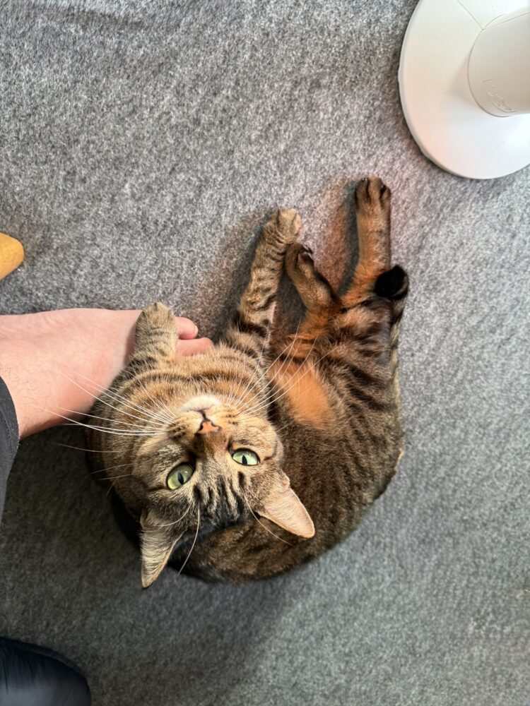 サルとウサウサのご飯の時は、シマキチ(キジトラの女の子)は、サルの左足に足タッチするか、乗っかる時間だよ。