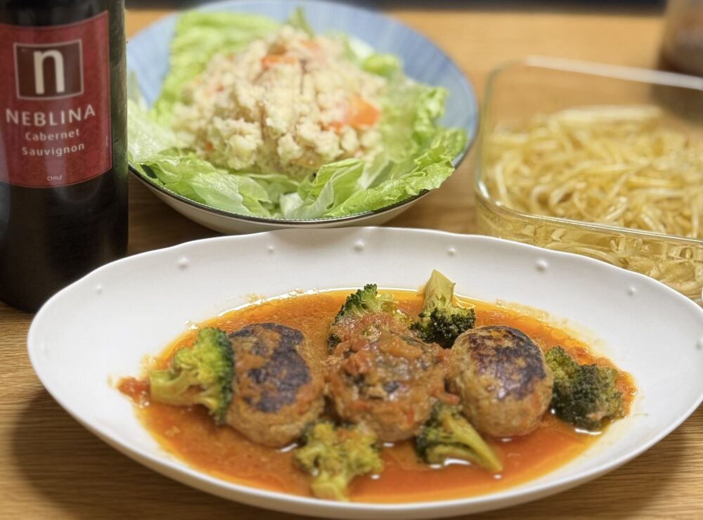 今夜はウサウサ特製のハンバーグ定食で、ご飯の代わりに赤ワインだよ