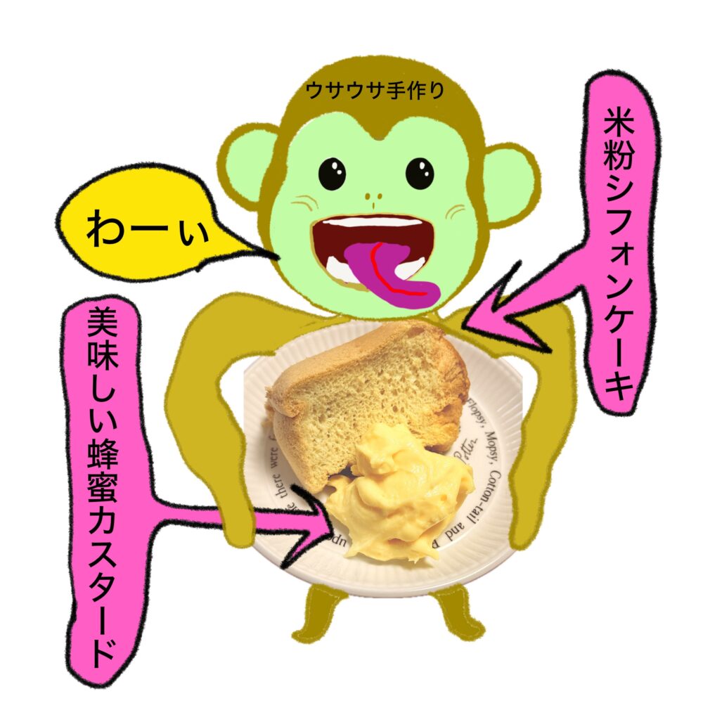 食べるだけのサルが言うのは変だけど、米粉のシフォンケーキは難易度高いと思う。なかなか売ってる小麦粉のシフォンケーキみたいにならなかった。