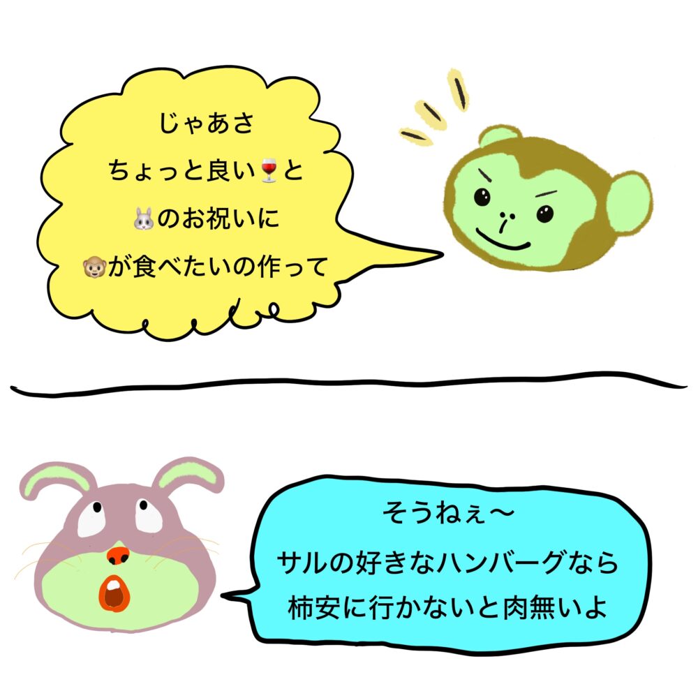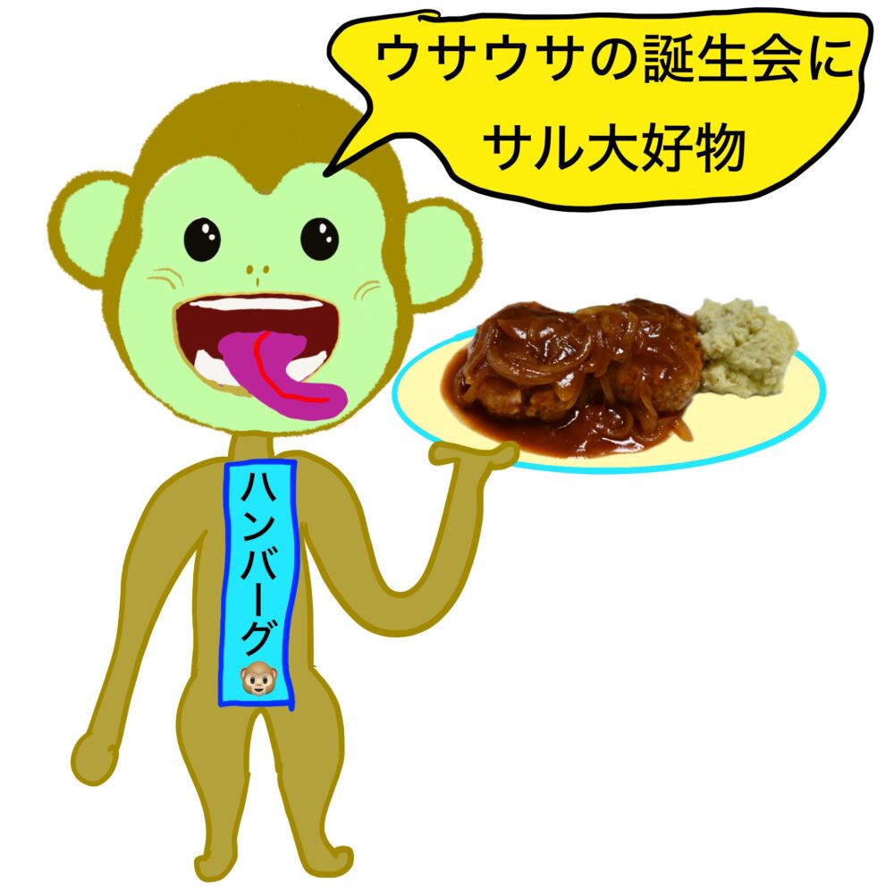 ウサウサ誕生日なのに、ウサウサ手作りハンバーグをオネダリするサルだった。
